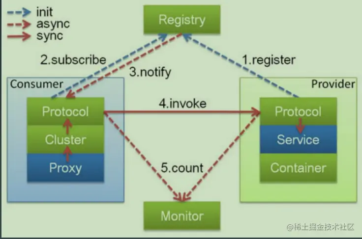 - Config配置层:对外配置接口,以ServiceConfig,ReferenceConfig为中心,可以直接初始化配置类,也可以通过Spring解析配置生成配置类