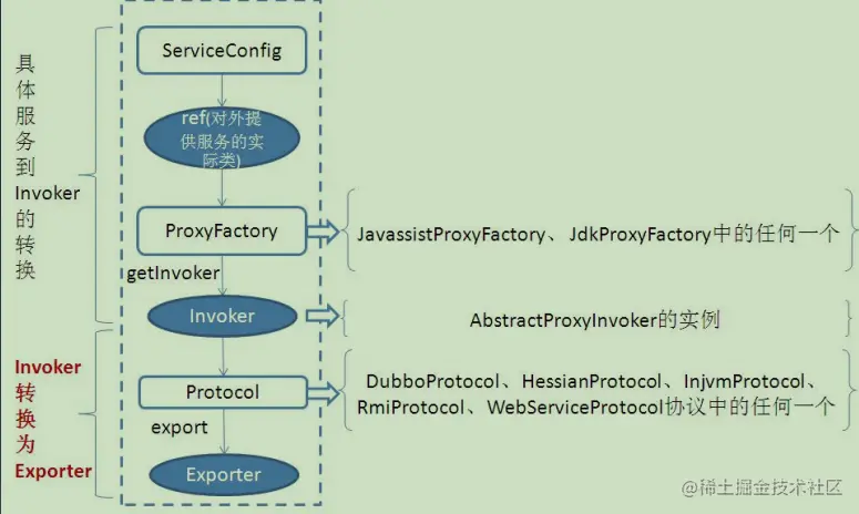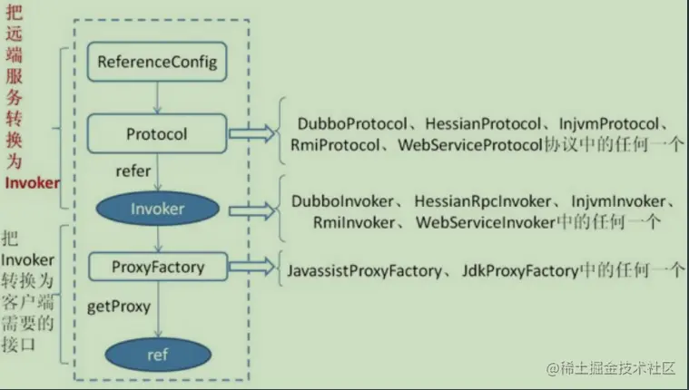 - Proxy 服务代理层:服务接口透明代理,生成服务的客户端Stub和服务器端Skeleton,以ServiceProxy为中心,扩展接口为ProxyFactory
