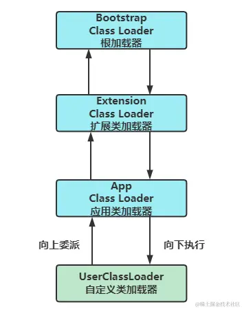 从上面的代码可以看出,当一个加载器收到类加载请求后,并不会自己去加载这个类,而是将这个类委派给父类去完成,每个层次类加载器都是这样,因此所有的类加载请求都会经过根加载器,只有当父加载器无法完成这个类的加载时,当前加载器才会自己尝试加载,这就是双亲委派机制,总结下来就是向上委派、向下执行。