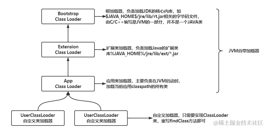 类加载器就是将编译之后的class字节码文件加载到内存中,并将这些内存转换为方法区中的运行时数据结构,注意类加载器只负责class文件的加载,至于是否可以运行需要由Execution Engin决定。