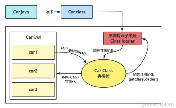 如下所示,一个Car.class二进制文件,通过类加载器初始化一个类模板,后面通过这个类模板来实例化得到各个car实例对象。