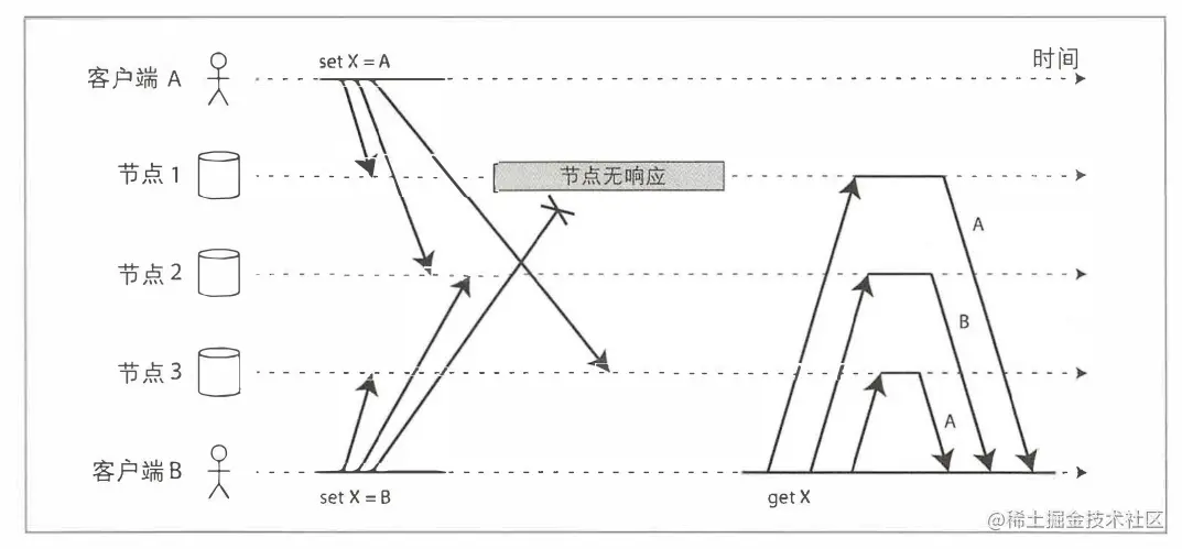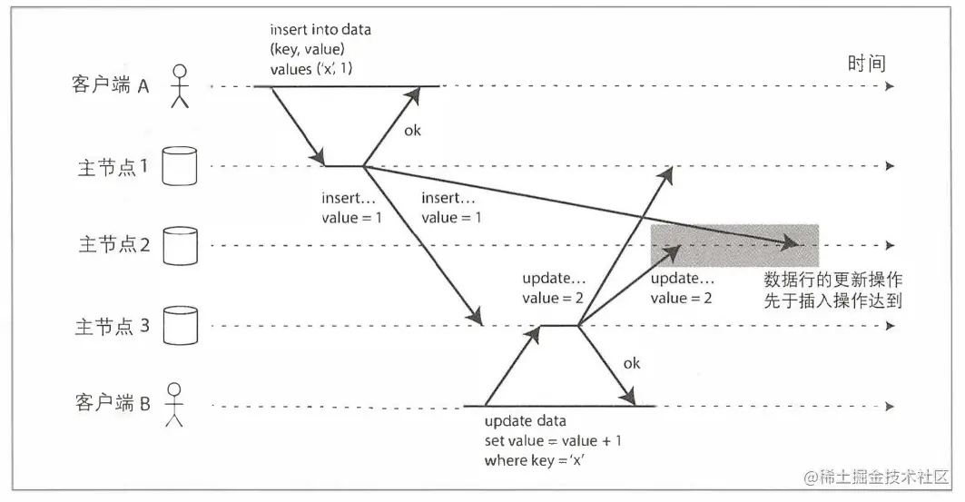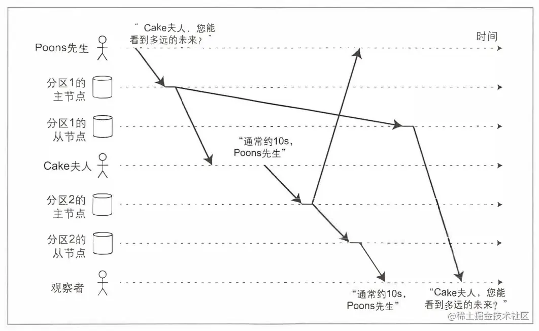 这是分区(分片)数据库中出现的一个特殊问题。如果数据库总是以相同的顺序写入,则读取总是看到一致的序列,不会发生这种反常。然而,在许多分布式数据库中,不同的分区独立运行,因此不存在全局写入顺序。这就导致当用户从数据库中读数据时,可能会看到数据库的某部分旧值和另一部分新值。