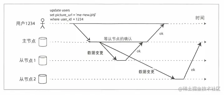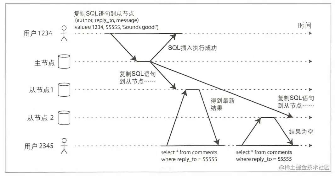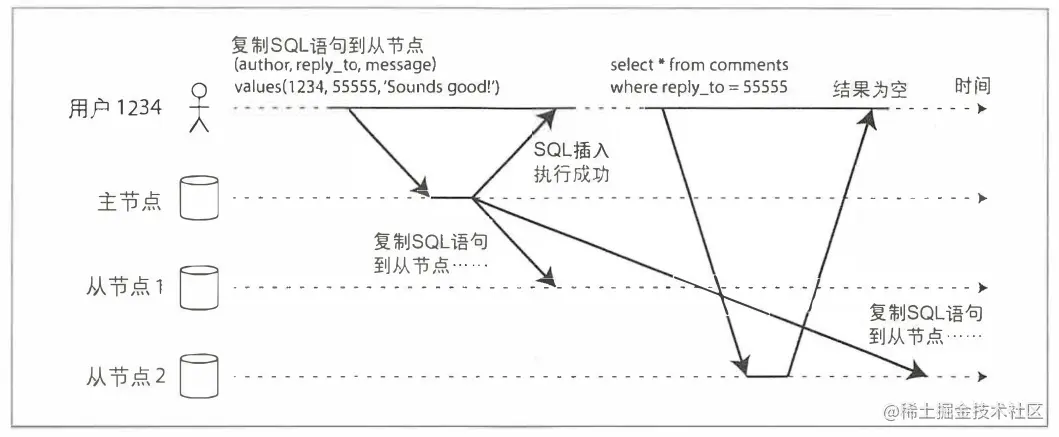 对于异步复制存在这样一个问题,如图所示,用户在写入不久即查看数据,则新数据可能尚未到达从节点。对用户来讲,看起来似乎是刚刚提交的数据丢失了: