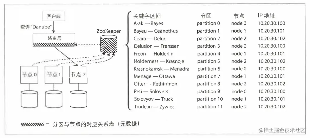 不管哪种方法,核心问题是:作出路由决策的组件如何知道分区与节点的对应关系以及其变化情况?该组件可能是某个节点,路由层或客户端。