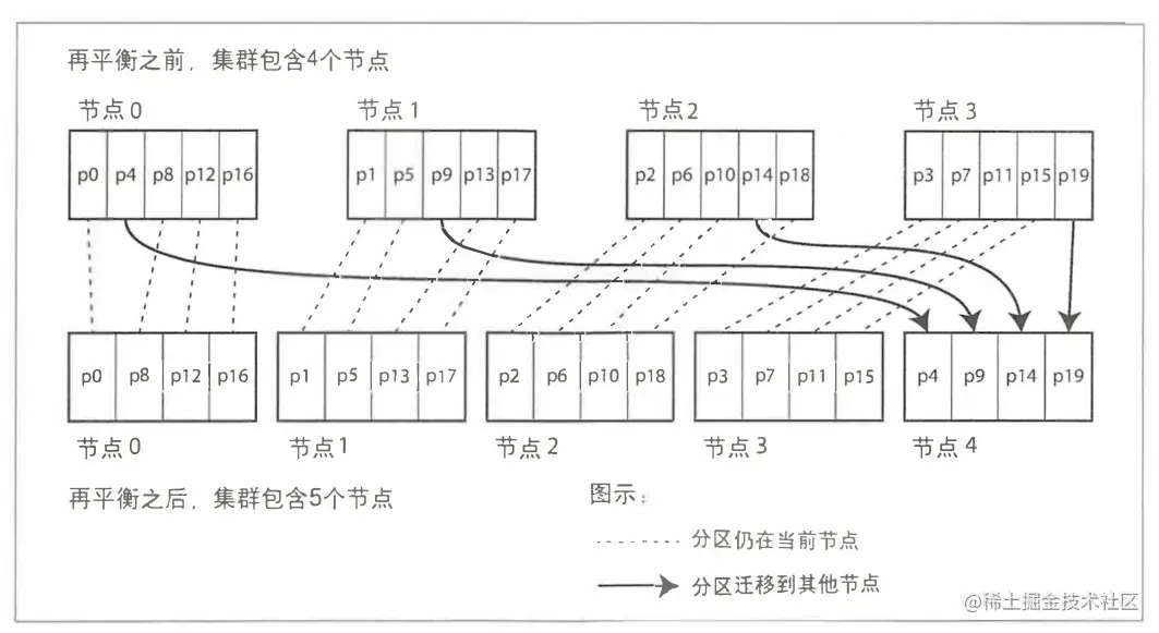 接下来,如果集群中添加了一个新节点,该新节点可以从每个现有的节点上匀走几个分区,直到分区再次达到全局平衡。如果从集群中删除节点,则采取相反的均衡措施。