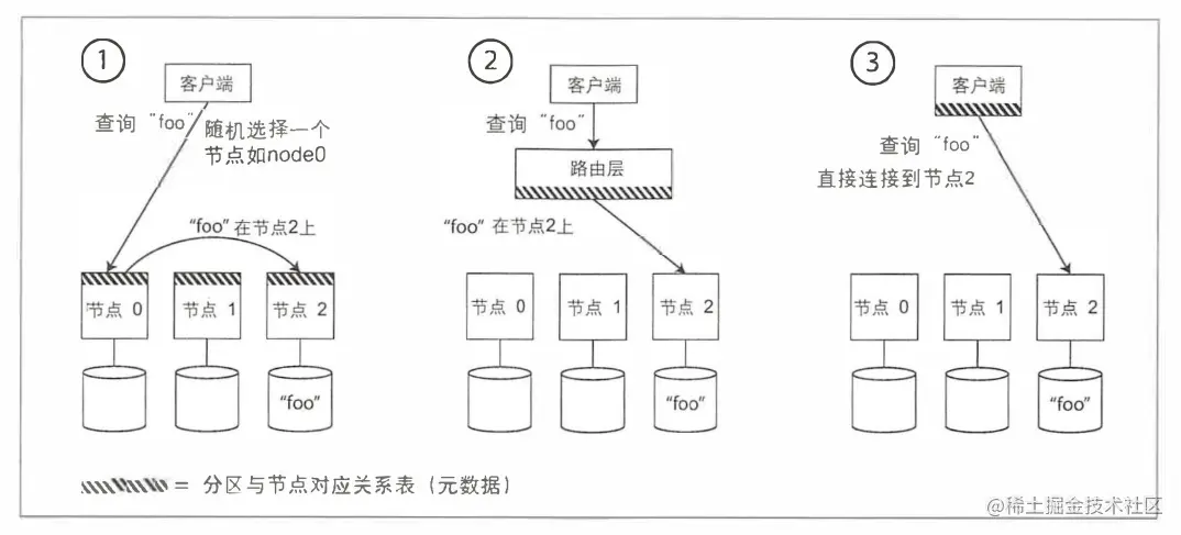 客户端感知分区和节点分配关系。此时,客户端可以直接连接到目标节点,而不需要任何中介。