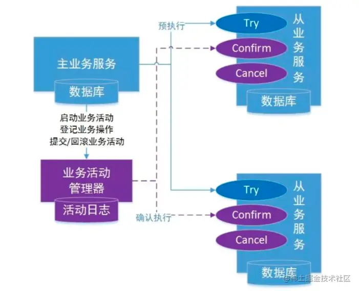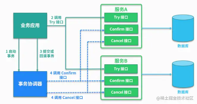 TCC 中的两阶段提交并没有对开发者完全屏蔽,也就是说从代码层面,开发者是可以感受到两阶段提交的存在。try、confirm、cancel 在执行过程中,一般都会开启各自的本地事务,来保证方法内部业务逻辑的 ACID 特性。其中: