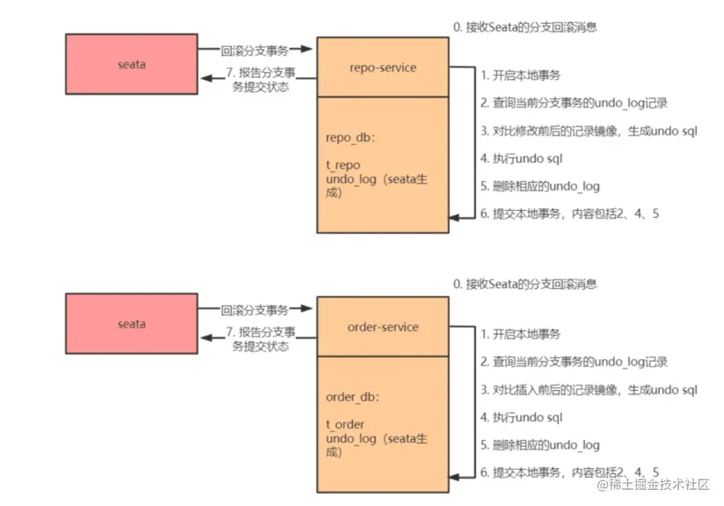 AT 模式之所以能够实现第一阶段完成就释放被锁定的记录,是因为 Seata 在每个服务的数据库中维护了一张 undo_log 表,其中记录了对分支事务进行操作前后记录的镜像数据,即便第二阶段发生异常,只需回放每个服务的 undo_log 中的相应记录即可实现全局回滚: