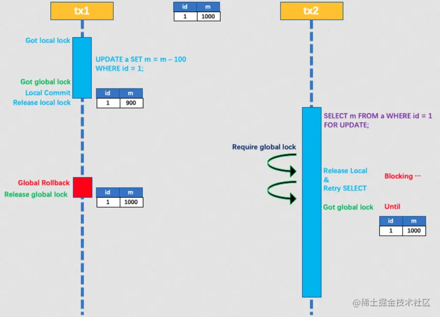 此时,如果 tx2 仍在等待该数据的全局锁,同时持有本地锁,则 tx1 的分支回滚会失败。分支的回滚会一直重试,直到 tx2 的全局锁等锁超时,放弃全局锁并回滚本地事务释放本地锁,tx1 的分支回滚最终成功。