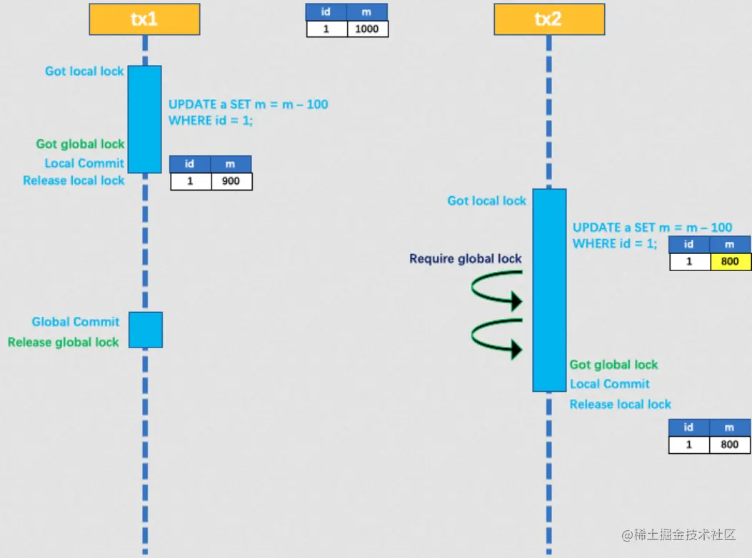 tx1 二阶段全局提交,释放全局锁。tx2 拿到全局锁提交本地事务。