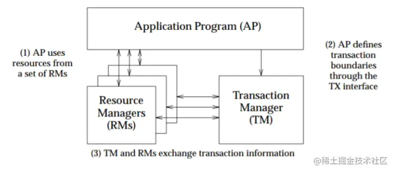 XA 规范定义了 (全局) 事务管理器 (Transaction Manager) 和 (局部) 资源管理器 (Resource Manager) 之间的接口。XA 接口是双向的系统接口,在事务管理器 (Transaction Manager) 以及一个或多个资源管理器 (Resource Manager) 之间形成通信桥梁。