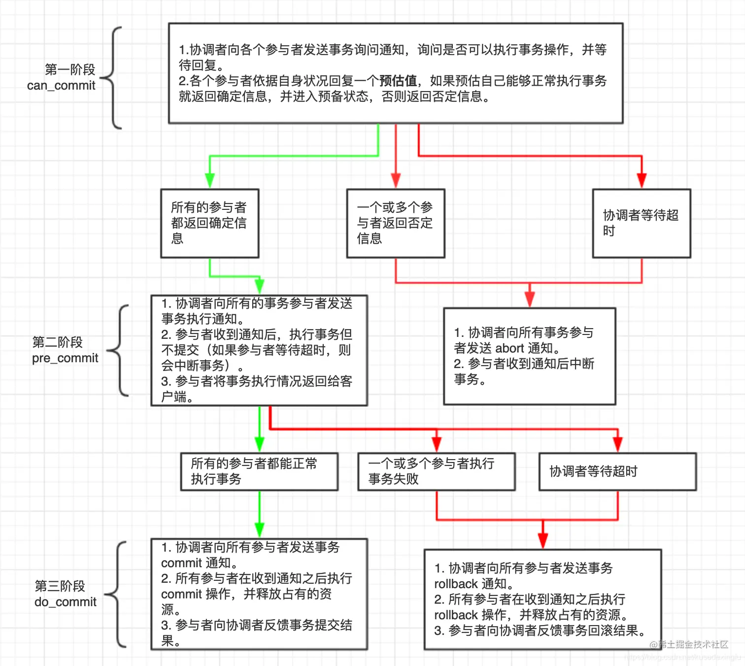 事务提交,参与者收到 Commit 请求后,会正式执行事务提交操作,并在完成提交操作之后,释放在整个事务执行期间占用的资源。