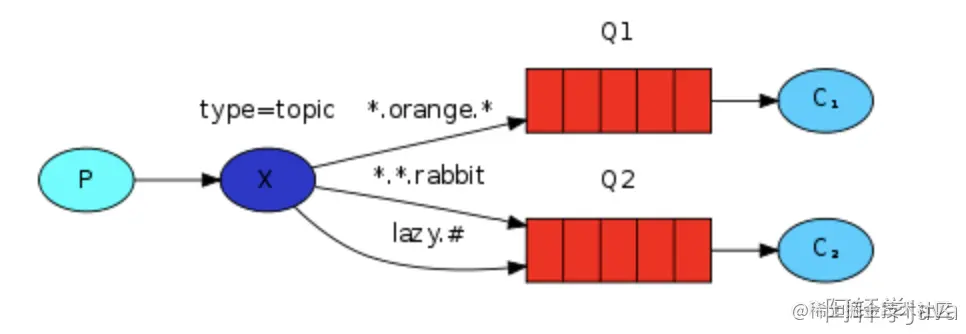 - 交换机根据key的规则模糊匹配到对应的队列,由队列的监听消费者接收消息消费(在我的理解看来就是routing查询的一种模糊匹配,就类似sql的模糊查询方式)。