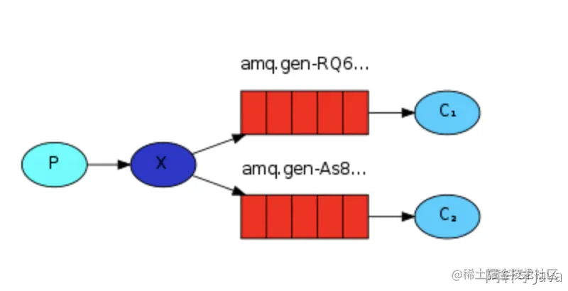 - 生产者将消息发给broker,由交换机将消息转发到绑定此交换机的每个队列,每个绑定交换机的队列都将接收到消息。
