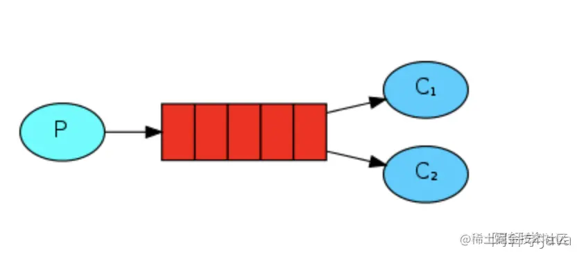 - 消息生产者将消息放入队列消费者可以有多个,消费者1、消费者2同时监听同一个队列,消息被消费。