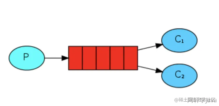 - C1 C2共同争抢当前的消息队列内容,谁先拿到谁负责消费消息(隐患:高并发情况下,默认会产生某一个消息被多个消费者共同使用,可以设置一个开关(syncronize)保证一条消息只能被一个消费者使用)。