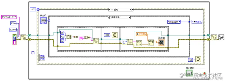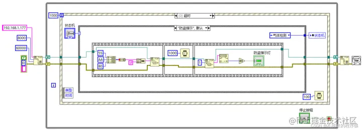 采用事件结构+超时结构来实现测量和控制两部分,在测量中使用条件结构+枚举的状态机来实现温度、气体浓度和热释电传感器数据的读取,将测量程序划分为3个状态:温度测量、气体检测和防盗指示。