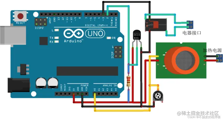 将DS18B20温度传感器的Vcc和GND分别连接至Arduino Uno控制器的+5V和GND,以给DS18B20提供电源,DS18B20的DQ引脚接至ArduinoUno控制器数字引脚D2,且连接4.7KΩ的上拉电阻,因为DS18B20的DQ引脚正常工作需要添加上拉电阻。