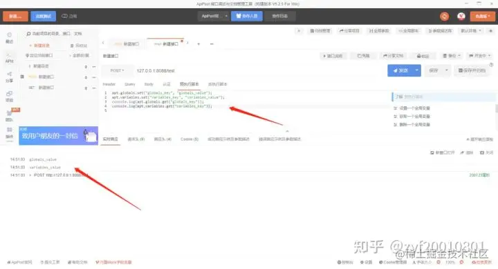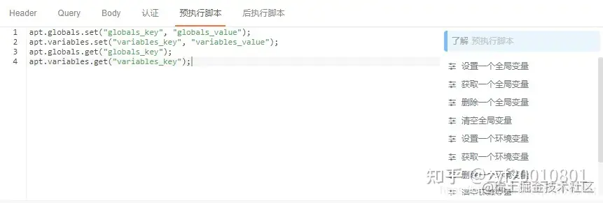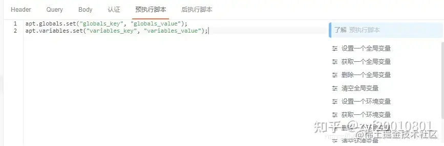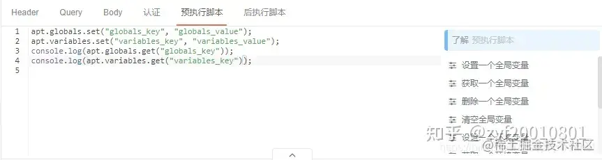 在apipost中通过预/后执行脚本设置全局变量或者环境变量。