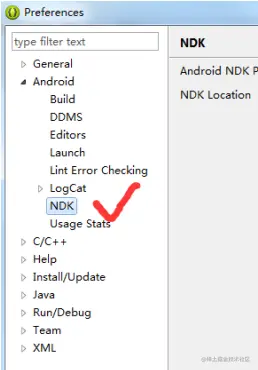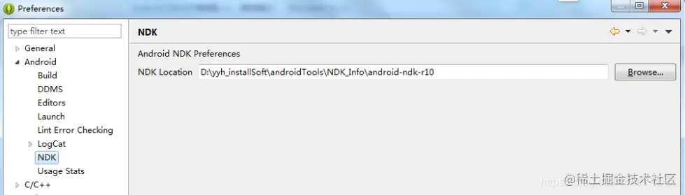 Window-->Preferences-->Android-->NDK(我当时的Eclipse没有NDK选项),