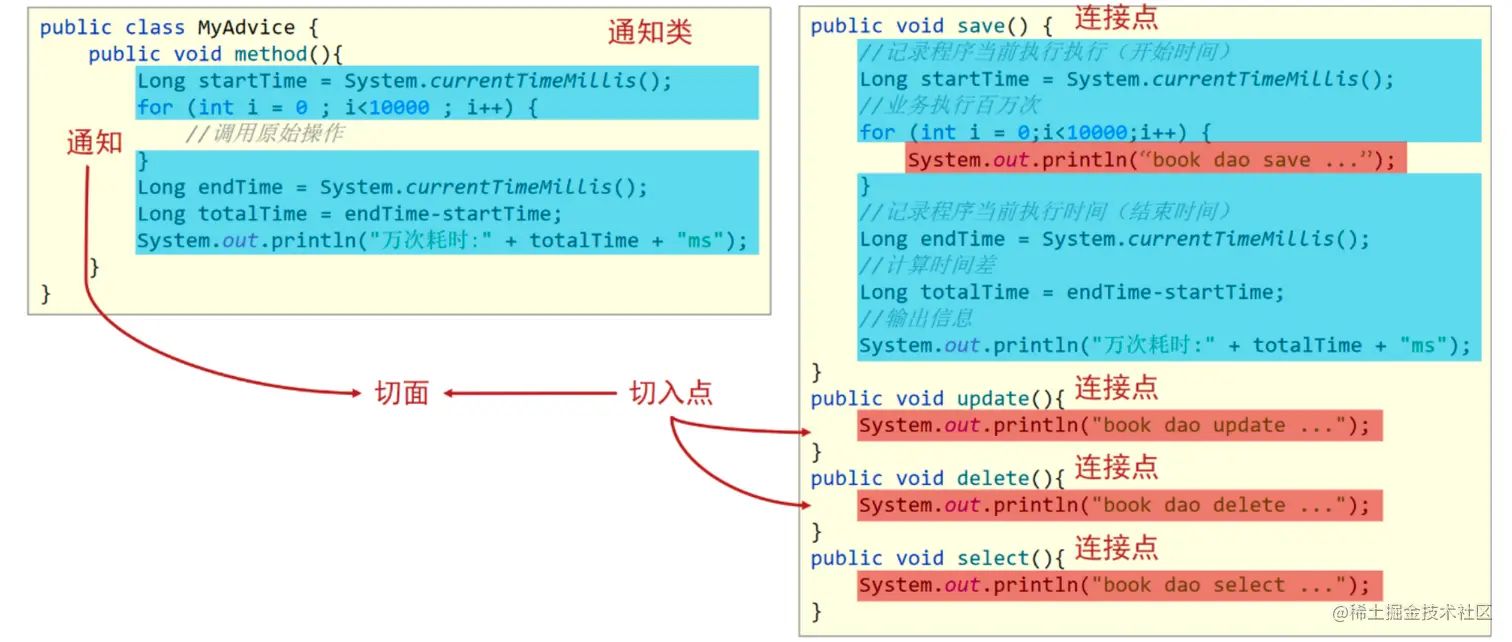 (3)执行BookServiceImpl的update和delete方法的时候都被添加了一个计算万次执行消耗时间的功能,将这个功能抽取到一个方法