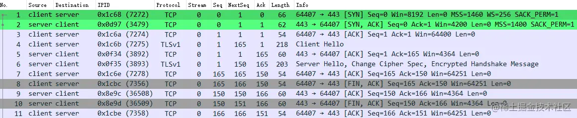 所以真正的问题是数据包乱序,重新排列的数据包 No.1-11 如下,才是正常的交互过程。