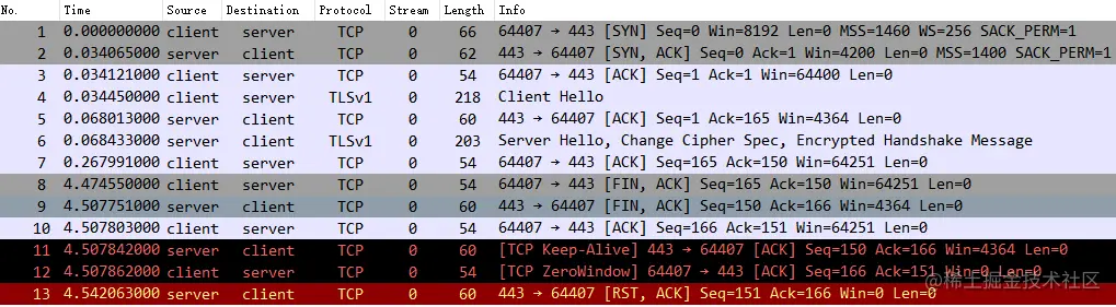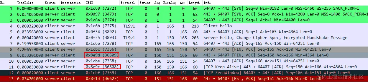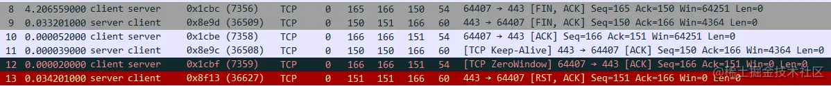 乍看之下,确实如问题描述一样,在 No.8 - 10 双方完成 TCP 四次挥手后,仍然产生了 No.11 - 13 交互数据包,像是 TCP 连接未正常关闭。