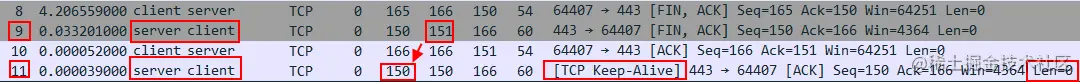 No.11 相较 No.9 ,它的 Seq Num 为 150 正好小于 No.9 Next Seq 151 一个字节,加上其他条件也满足,因此标记成了 TCP Keep-Alive 数据包。