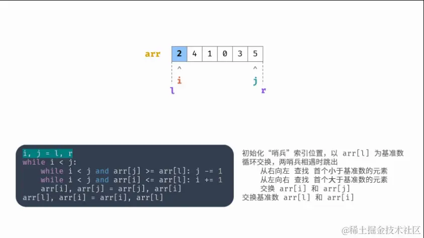 哨兵划分操作: 以数组某个元素(一般选取首元素)为 基准数 ,将所有小于基准数的元素移动至其左边,大于基准数的元素移动至其右边。
