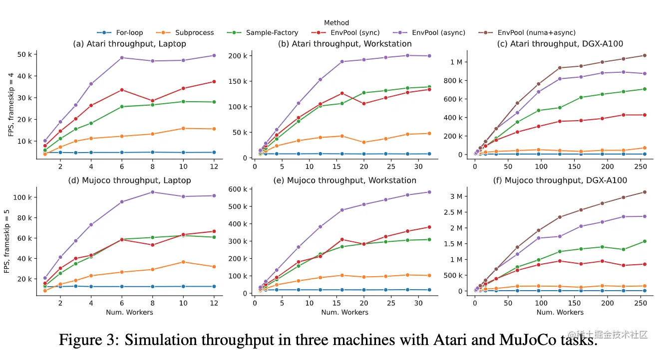论文简介:On a high-end machine, EnvPool achieves 1 million frames per second for the environment execution on Atari environments and 3 million frames per second on MuJoCo environments./在一台高端机器上,EnvPool在Atari环境下的执行速度达到每秒100万帧,在MuJoCo环境下达到每秒300万帧。