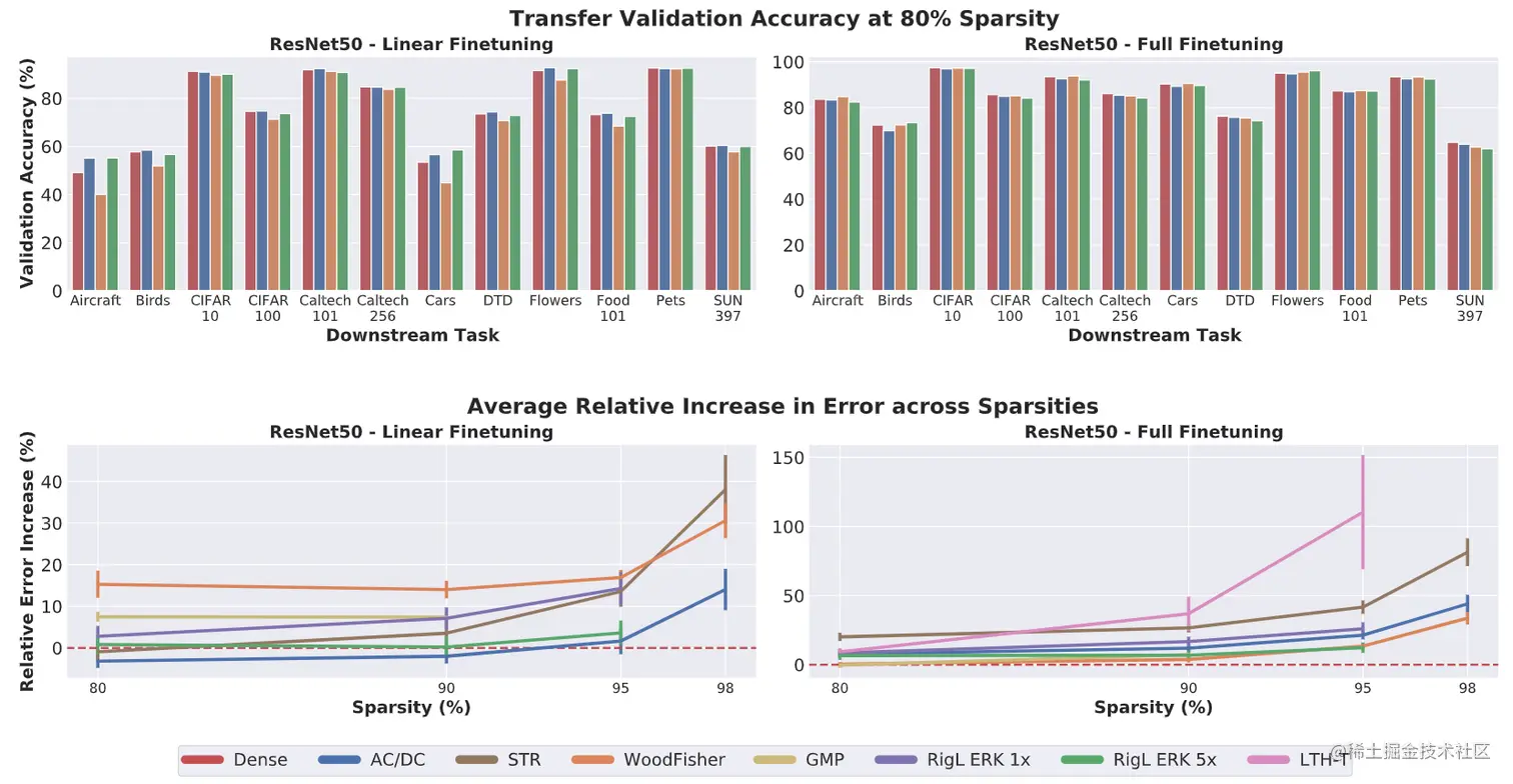 迁移学习是一个经典的范式,通过对大型 "上游 "数据集的预训练,使模型在 "下游 "专业数据集上产生良好的结果。一般来说,在 "上游 "数据集上更准确的模型往往能在 "下游 "提供更好的迁移精度。在这项工作中,我们在ImageNet数据集上训练的卷积神经网络(CNN)的背景下对这一现象进行了深入调查,这些卷积神经网络已经被修剪过,也就是说,通过疏散连接来压缩模型。我们考虑使用非结构化的修剪模型进行迁移,这些模型是通过应用几种最先进的修剪方法获得的,包括基于量级的、二阶的、再生长的、抽签的和正则化的方法,在12个标准迁移任务的背景下。简而言之,我们的研究表明,稀疏模型可以匹配甚至超越密集模型的迁移性能,即使是在高稀疏度的情况下,而且,在这样做的同时,可以导致显著的推理甚至训练速度的提高。同时,我们观察并分析了不同剪枝方法的行为的显著差异。