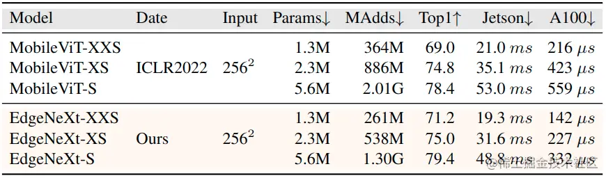 论文简介:Our EdgeNeXt model with 1. 3M parameters achieves 71. 2% top-1 accuracy on ImageNet-1K, outperforming MobileViT with an absolute gain of 2. 2% with 28% reduction in FLOPs./我们的EdgeNeXt模型用1.3M的参数在ImageNet-1K上实现了71. 2%的top-1准确性,比MobileViT的绝对收益高出2.2%,FLOPs减少28%。