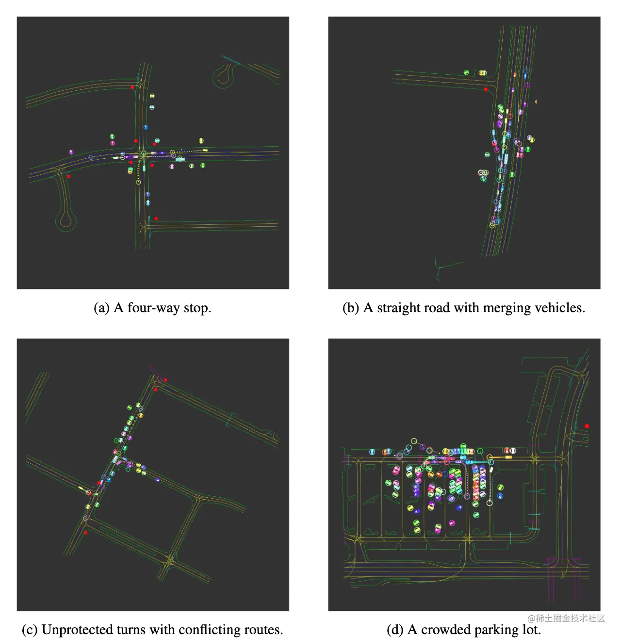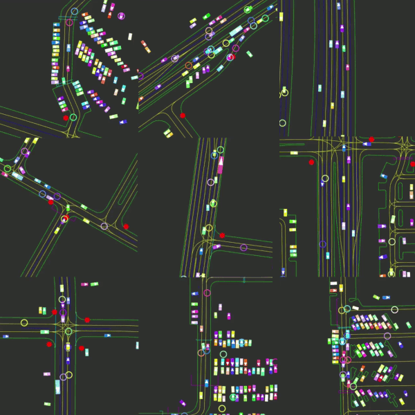 论文摘要:We introduce \textit{Nocturne}, a new 2D driving simulator for investigating multi-agent coordination under partial observability. The focus of Nocturne is to enable research into inference and theory of mind in real-world multi-agent settings without the computational overhead of computer vision and feature extraction from images. Agents in this simulator only observe an obstructed view of the scene, mimicking human visual sensing constraints. Unlike existing benchmarks that are bottlenecked by rendering human-like observations directly using a camera input, Nocturne uses efficient intersection methods to compute a vectorized set of visible features in a C++ back-end, allowing the simulator to run at 2000+ steps-per-second. Using open-source trajectory and map data, we construct a simulator to load and replay arbitrary trajectories and scenes from real-world driving data. Using this environment, we benchmark reinforcement-learning and imitation-learning agents and demonstrate that the agents are quite far from human-level coordination ability and deviate significantly from the expert trajectories.