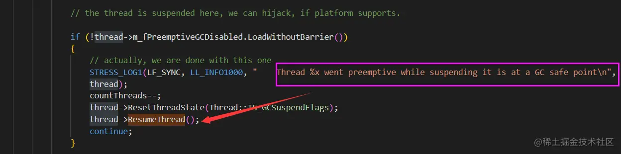 从线程栈看,流程大概是: C# 分配一个对象,触发了 GC,然后暂停了所有托管线程,然后又恢复了其中一个线程,应该是此线程没有停留在 gc 安全点上,重启是为了让它在安全点暂停,在 coreclr 源码上也能看的出来。