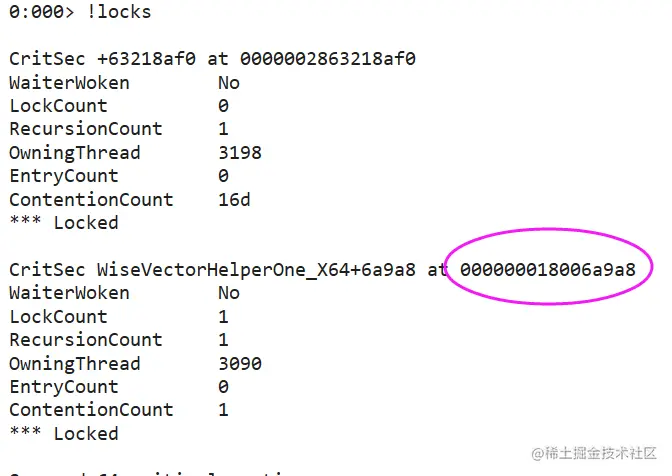 要想寻找这个答案,可以用 !locks 来观察当前处于 临界区 的线程,输出如下: