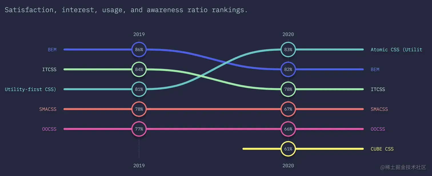根据 CSS 状态 2020 的调查结果显示,目前使用最多的五种分别为: BEM、ACSS、OOCSS、SMACSS、ITCSS。