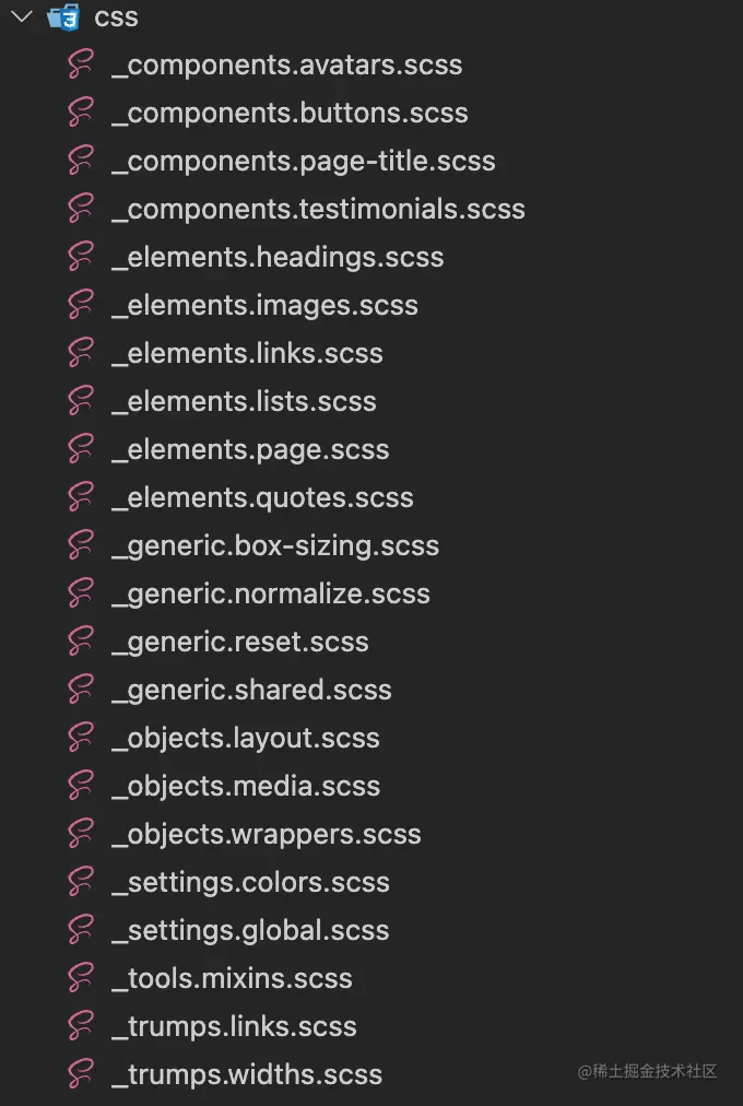 第五层 OBJECTS 表示对象,可以在这一层定义整个项目中可重用的页面结构类。与上一层相比,这一层对 DOM 的影响更小,具有更高的特异性(优先级),并且更加明确,因为现在将 DOM 的部分作为目标来设置了样式。