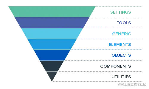 ITCSS 的目标是通过分层组织 CSS 文件,实现了自下而上的特异性。它基于分层的概念把项目中的样式分为七层: