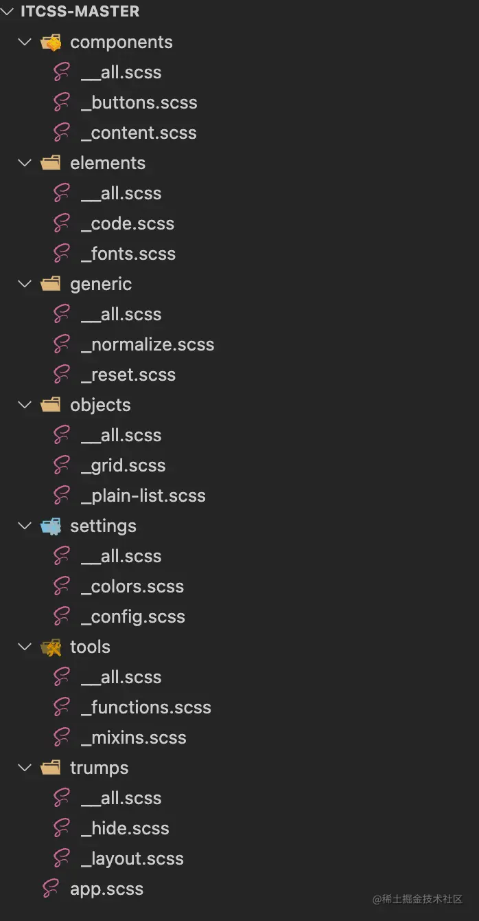 第一层 SETTINGS 表示设置,这一层包含项目的所有全局设置。通常会定义一些全局变量,例如颜色、字体大小等,这一层不会生成实际的 CSS。