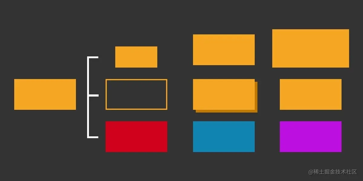 平时我们可能习惯性的把全部样式都写在同一个class 中,就像上面代码一样。此时如果我们需要新增一个主题为 success 的按钮呢?你可能会这样做: