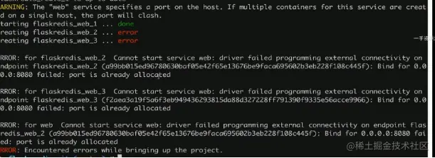这个失败的原因,是因为yml里面对web做了端口映射,但是如果启动3个容器,是没办法把各自端口都映射到同一个端口8080上的,这里我们先删除ports字段,然后启动: