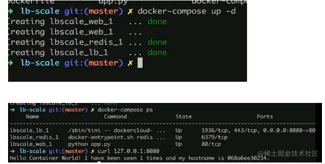HAProxy充当负载均衡器,可以把外界的访问流量转发到任意一个web容器上,同时任意一个web容器都对接redis容器,这样部署web服务将来的扩展性也会很强,例如将来发现流量暴增,传统做法是加机器,现在通过compose我们可以很快把web容器扩展到10个。