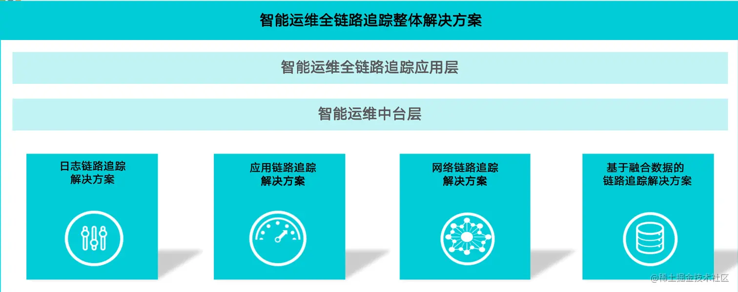 全链路业务追踪整体解决方案整体依托监控工具和智能运维平台,主要包含以下四个解决方案,日志链路追踪解决方案、应用链路解决方案、网络链路解决方案、基于融合数据的全链路追踪解决方案。 前三种解决方案依托监控工具,第四种基于融合数据的解决方案,融合各种运维数据,基于智能运维中台和算法能力。实现最终全链路最终目标。