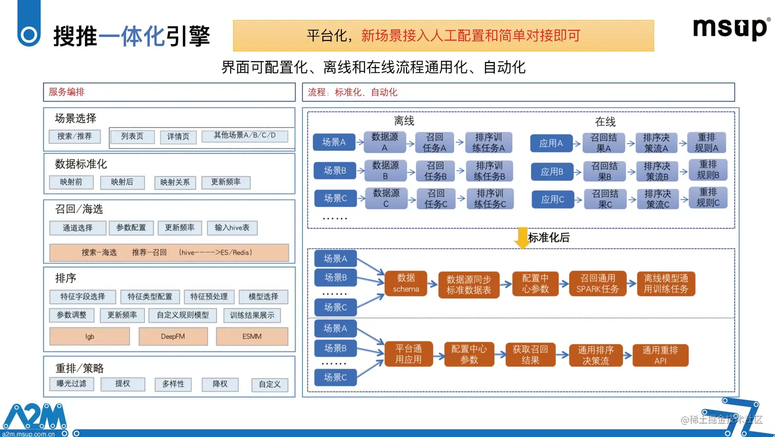 一个算法组件基本上分为两部分。一个是离线部分,离线部分就是一个标准的表,一个标准的任务格式,输出一个标准的结果类型,这是一个离线的组件。另一个是在线组件,会对我们不同的在线推理算法进行一些标准在线推理的代码。通过这种组件化,我们把一个新场景的接入时间从平均一个月降低到了一周到两周。
