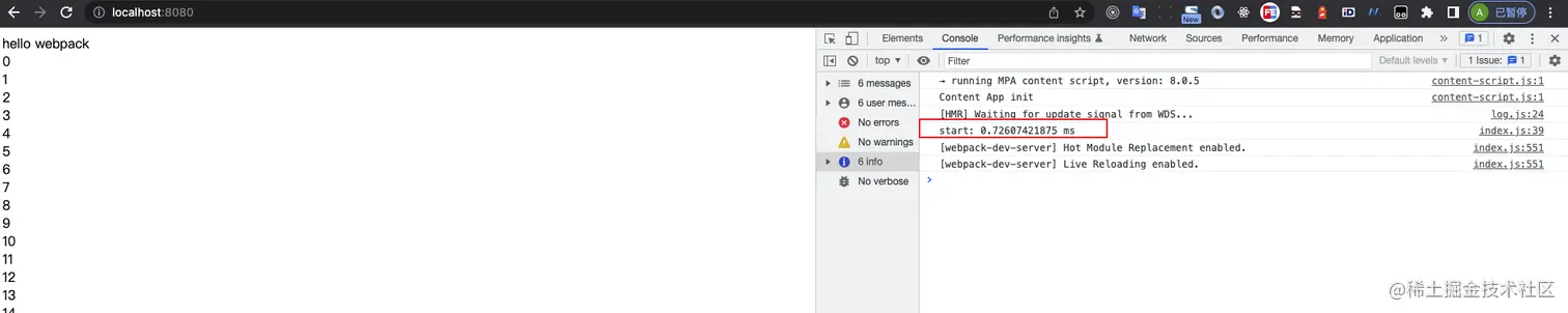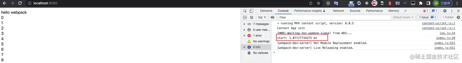我们看下测试结果,控制台上打印时间是start: 0.72607421875 ms
