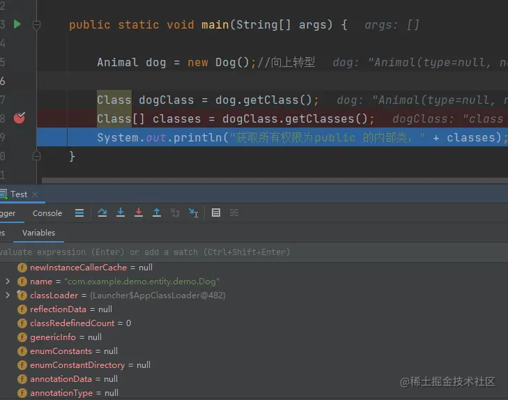 Class[] classes = dogClass.getClasses();