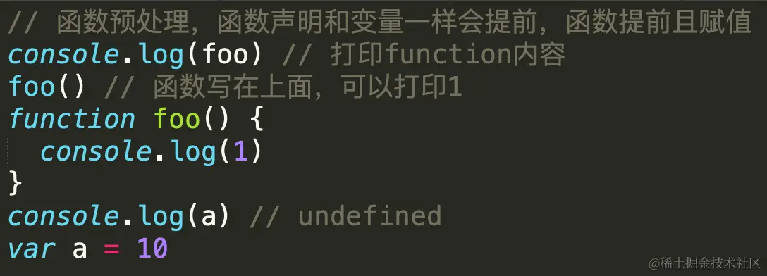 函数预处理,函数声明时会提前,并做好预处理,函数名赋值和确定作用域的范围