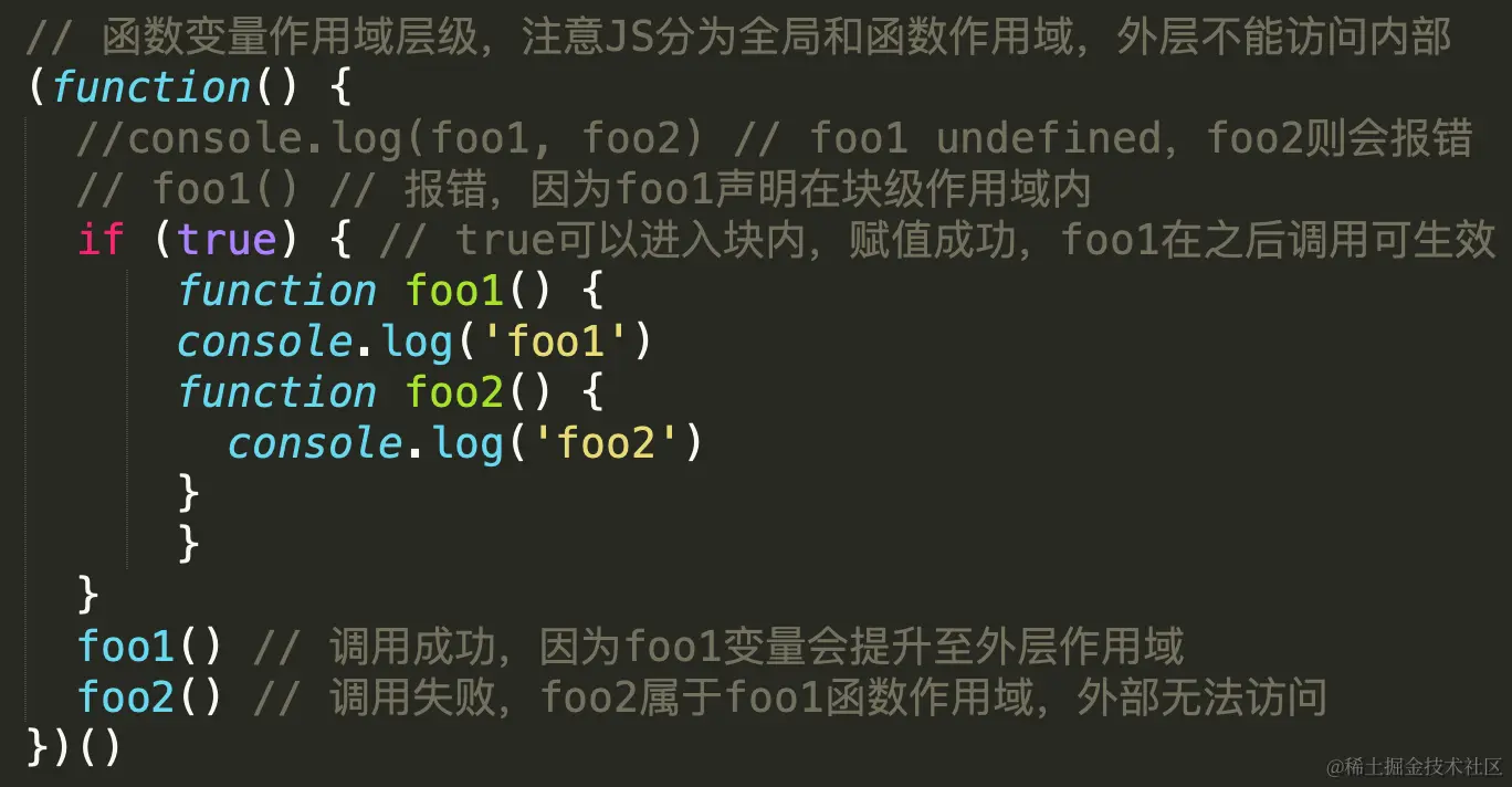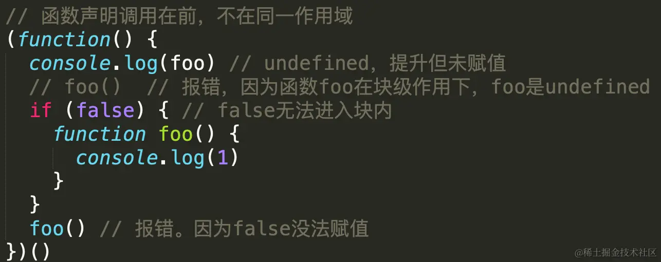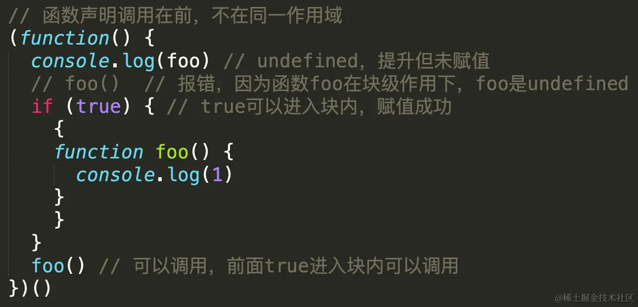 - 在块级作用域下,函数会跨级提升,会确定作用域,但是不会赋值。只有块被执行后才会赋值。函数作用域下的子函数名只会提升至父函数,不会超过父函数的作用域。