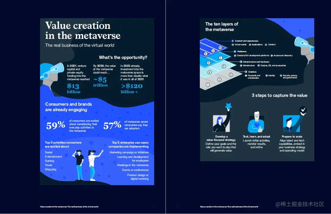 麦肯锡对亚太地区、中国、欧洲和美国的3400多名消费者和高级管理人员进行了调查,以深入了解当前元宇宙圈用户的习惯--他们的动机、他们正在做的事情,以及他们期望做的事情。在分析元宇宙的价值创造潜力和总投资情况时,我们研究了主要企业、风险资本和私人股权基金的活动驱动因素。麦肯锡研究了元数据对与其技术和用途最密切相关的部门的潜在影响,并以额外的研究、案例研究和现实世界的例子来补充我们的工作。该报告还包括对五个行业的深入分析:服装、时尚和奢侈品;消费包装产品;金融服务;零售;以及电信、媒体和技术。