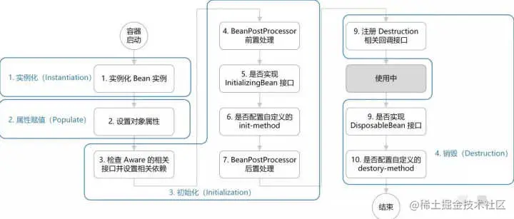 - 等到完全初始化之后,就会把二级缓存给remove掉,放到一级缓存中。 我们使用的bean是一级缓存的